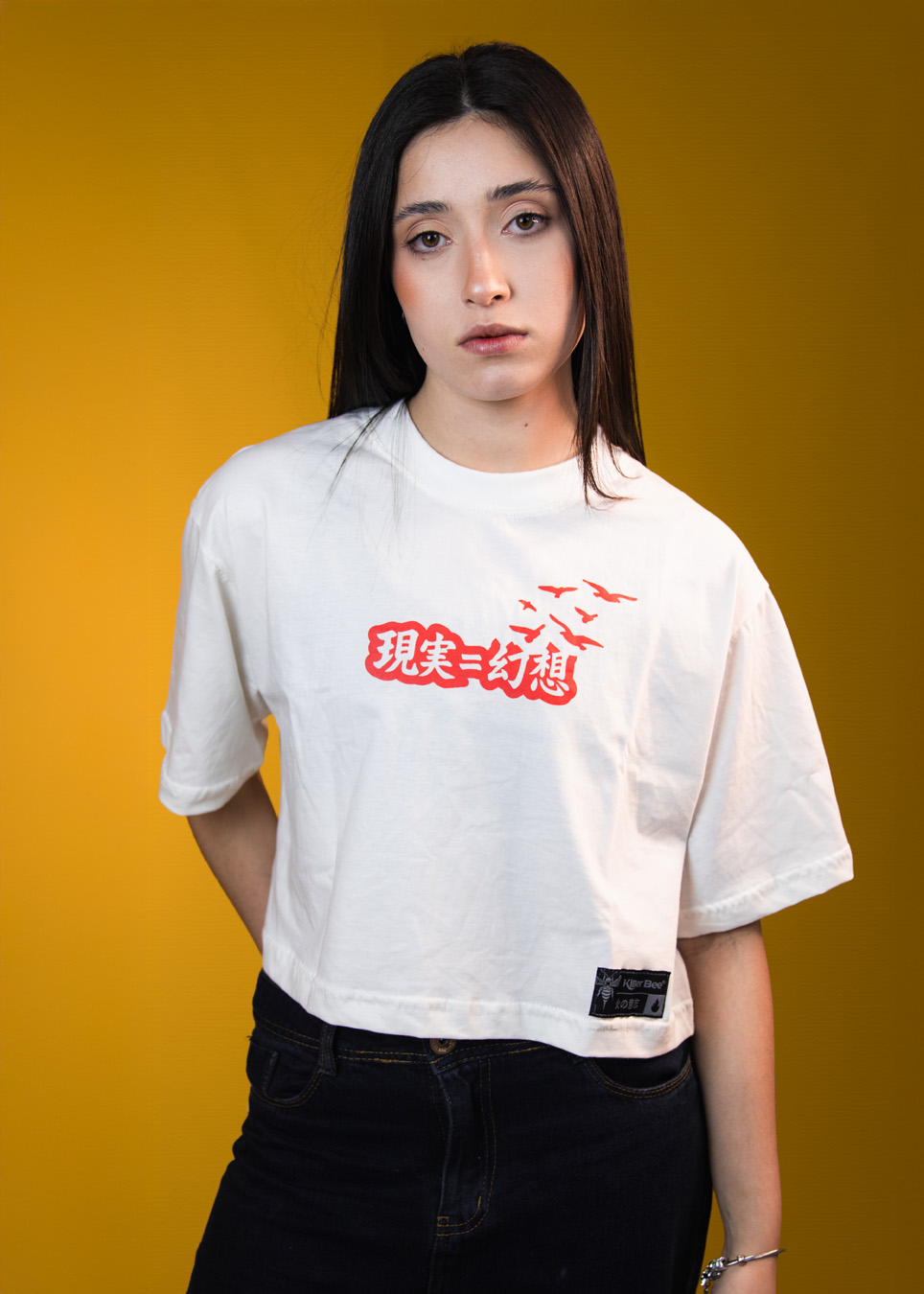 Na parte frontal, a frase “現実=幻想” (realidade = ilusão) joga luz sobre seu genjutsu lendário, lembrando que a mente é o campo de batalha mais poderoso. Atrás, o anel vermelho com o kanji “朱” (vermelhão) simboliza redenção — um tributo ao irmão que sacrificou tudo para proteger a verdade. Esta camiseta captura a dualidade de Itachi: mestre da ilusão e guardião silencioso da paz.