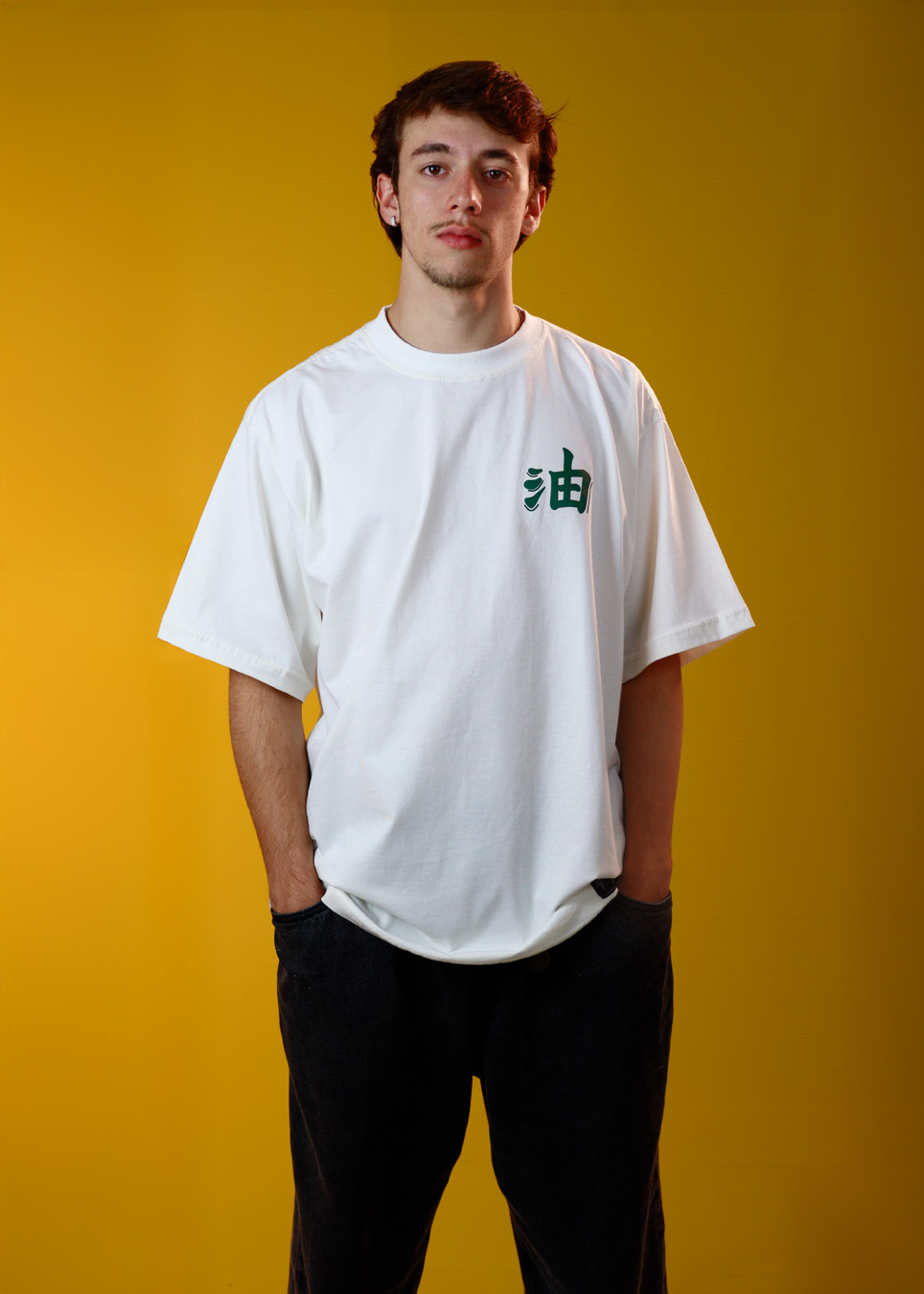 Corte oversized com ombros drop (mais baixos) e caimento boxy (forma retangular), garantindo movimento livre sem marcar o corpo. Para obter o ajuste certo, escolha seu tamanho habitual — não é necessário subir de numeração para garantir o visual solto.